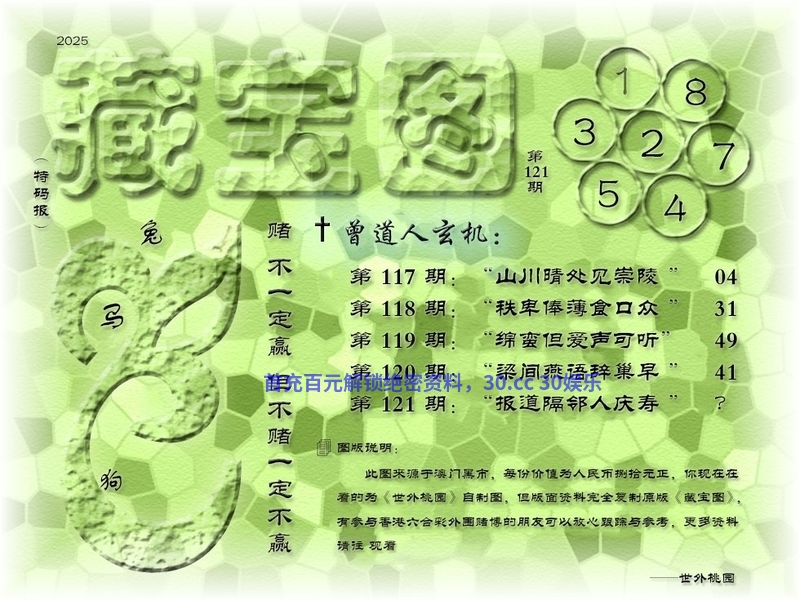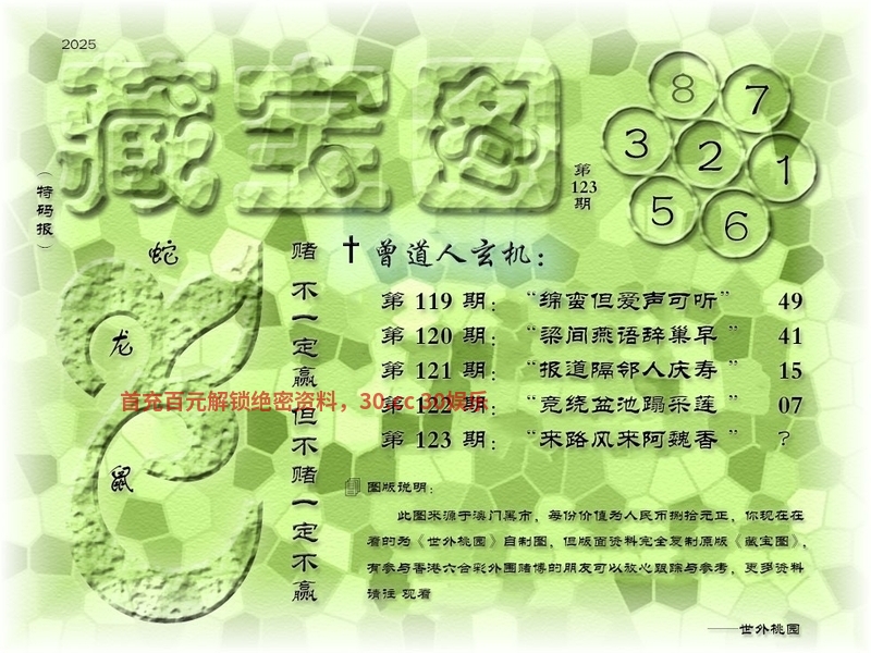 123期藏寶圖新:得君海错俱奇绝 老:极目双峰剑倚天 禁:龙 禁:6尾 玄機字:《旄》